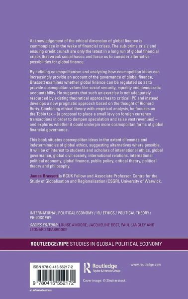 Acknowledgement of the ethical dimension of global finance is commonplace in the wake of financial crises. The sub-prime crisis and ensuing credit crunch are only the latest in a long run of global financial crises that wreak social havoc and force us to consider alternative possibilities for global finance. By defining cosmopolitanism and analysing how cosmopolitan ideas can increasingly provide an account of the governance of global finance, Brassett examines whether global finance can be regulated so as to provide cosmopolitan values like social security, equality and democratic accountability. It suggests that such an exercise is not adequately resourced by existing theoretical approaches to critical IPE and instead develops a new pragmatic approach based on the thought of Richard Rorty. Combining ethical theory with empirical analysis, it focuses on the Tobin Tax - (a proposal to place a small levy on foreign currency transactions to dampen speculation and raise vast revenues) - and explores whether it could underpin more cosmopolitan forms of global financial governance. This book situates cosmopolitan ideas in the extant dilemmas and indeterminacies of global ethics, suggesting alternatives where possible. It will be of interest to students and scholars of international ethics, global governance, global civil, international relations, international political economy, global finance, public policy, critical theory, political theory and philosophy.
