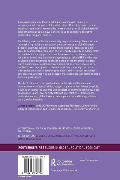 Acknowledgement of the ethical dimension of global finance is commonplace in the wake of financial crises. The sub-prime crisis and ensuing credit crunch are only the latest in a long run of global financial crises that wreak social havoc and force us to consider alternative possibilities for global finance. By defining cosmopolitanism and analysing how cosmopolitan ideas can increasingly provide an account of the governance of global finance, Brassett examines whether global finance can be regulated so as to provide cosmopolitan values like social security, equality and democratic accountability. It suggests that such an exercise is not adequately resourced by existing theoretical approaches to critical IPE and instead develops a new pragmatic approach based on the thought of Richard Rorty. Combining ethical theory with empirical analysis, it focuses on the Tobin Tax - (a proposal to place a small levy on foreign currency transactions to dampen speculation and raise vast revenues) - and explores whether it could underpin more cosmopolitan forms of global financial governance. This book situates cosmopolitan ideas in the extant dilemmas and indeterminacies of global ethics, suggesting alternatives where possible. It will be of interest to students and scholars of international ethics, global governance, global civil, international relations, international political economy, global finance, public policy, critical theory, political theory and philosophy.