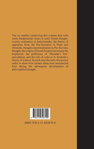 The six studies comprising this volume deal with some fundamental issues in early Greek thought: cosmic evaluation in Anaximander, the theory of opposites from the Pre-Socratics to Plato and Aristotle, thought experimentation in Pre-Socratic thought, the origins of Greek Scepticism among the Sophisists, the prehistory of "Buridan's Ass" speculation, and the role of esthesis in Aristotle's theory of science. In each case the early discussion seeks to show how certain ideas bore unexpected fruit during the subsequent development of philosophical thought.