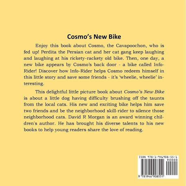 A charming and delightful 32 page children's picture book about a down-and-out pup named Cosmo whose bike is slightly shabby. The neighborhood cats find it amusing to razz him about his bike. One morning Cosmo wakes to find a new and wonderful bike named Info-Rider who magically helps Cosmo have great times with this new bike. Cosmo is excited and happy to have his new bike. Come, join the fun and read about Cosmo and his new bike!