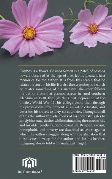 Cosmos is a flower. Cosmos Screen is a patch of cosmos flowers observed at the age of five; iconic pleasant first memories for the author. It is from this screen that he relates the story of his life. It is also the screen beyond which he relates something of his ancestry. The story follows the author from that cosmos screen in rural southern Alabama in 1930, through the Great Depression of the thirties, World War 11, his college years, then through his professional development as an artist educator, and describes his travels to forty-six countries. Throughout all of this the author threads stories of his secret struggles to satisfy his sexual desires while maintaining the secret of his, and his older brother's, homosexual life. Religion, racism, homophobia and poverty are described as issues against which the author struggles along with the alienation that these issues develop for the author and for his brother. Intriguing stories told with analytical insight.