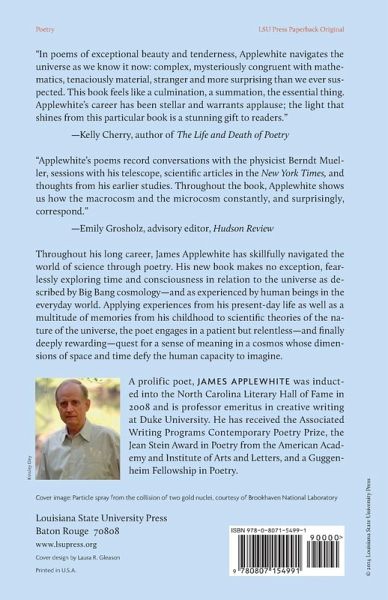 Throughout his long career, James Applewhite has skillfully navigated the world of science through poetry. His new book makes no exception, fearlessly exploring time and consciousness in relation to the universe as described by Big Bang cosmology-and as experienced by human beings in the everyday world. Applying experiences from his present-day life as well as a multitude of memories from his childhood to scientific theories of the nature of the universe, the poet engages in a patient but relentless-and finally deeply rewarding-quest for a sense of meaning in a cosmos whose dimensions of space and time defy the human capacity to imagine. In his quest, Applewhite suggests the continuing possibility of a crucial connection to the universe through our seemingly tiny, evanescent experiences here on planet Earth. The poems in Cosmos help us value the human-related dimensions of being all the more as they are discerned against the cosmic vastness.