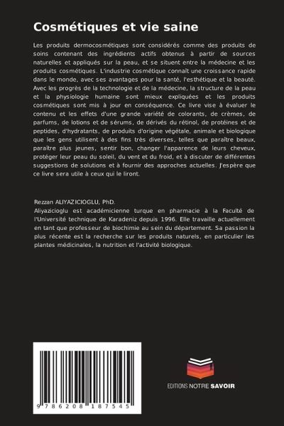 Les produits dermocosmétiques sont considérés comme des produits de soins contenant des ingrédients actifs obtenus à partir de sources naturelles et appliqués sur la peau, et se situent entre la médecine et les produits cosmétiques. L'industrie cosmétique connaît une croissance rapide dans le monde, avec ses avantages pour la santé, l'esthétique et la beauté. Avec les progrès de la technologie et de la médecine, la structure de la peau et la physiologie humaine sont mieux expliquées et les produits cosmétiques sont mis à jour en conséquence. Ce livre vise à évaluer le contenu et les effets d'une grande variété de colorants, de crèmes, de parfums, de lotions et de sérums, de dérivés du rétinol, de protéines et de peptides, d'hydratants, de produits d'origine végétale, animale et biologique que les gens utilisent à des fins très diverses, telles que paraître beaux, paraître plus jeunes, sentir bon, changer l'apparence de leurs cheveux, protéger leur peau du soleil, du vent et du froid, et à discuter de différentes suggestions de solutions et à fournir des approches actuelles. J'espère que ce livre sera utile à ceux qui le liront.
