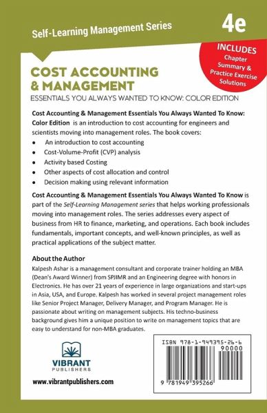 Comes with Chapter Summaries and Solutions to Practice Exercise Fundamentals and important principles included Practical approach for application by business professionals Solved examples with real-life business scenarios Cost Accounting & Management Essentials You Always Wanted To Know: 4th Edition is an introduction to cost accounting for engineers and scientists moving into management roles. It is structured in a compact and easy-to-understand format so that beginners to the subject will gain an understanding of cost accounting and managerial accounting. The book covers: An introduction to cost accounting Cost-Volume-Profit (CVP) analysis Activity based Costing Cost management Other aspects of cost allocation and control Decision-making using relevant information About the Series The Self-Learning Management series is designed to help students, new managers, career switchers and entrepreneurs learn essential management lessons. This series has management books, finance and accounting books, and strategy and marketing books designed to address every aspect of business from HR to Finance to Marketing to Operations. Each book includes basic fundamentals, important concepts, standard and well-known principles as well as practical ways of application of the subject matter. The distinctiveness of the series lies in that all the relevant information is bundled in a compact form that is very easy to interpret.