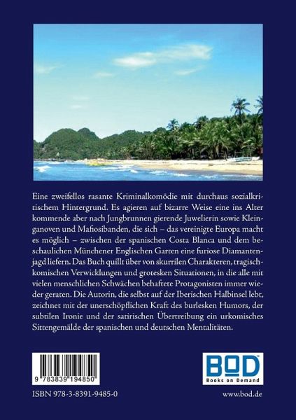 Eine zweifellos rasante Kriminalkomödie mit durchaus sozialkritischem Hintergrund. Es agieren auf bizarre Weise eine ins Alter kommende aber nach Jungbrunnen gierende Juwelierin sowie Kleinganoven und Mafiosibanden, die sich - das vereinigte Europa macht es möglich - zwischen der spanischen Costa Blanca und dem beschaulichen Münchener Englischen Garten eine furiose Diamantenjagd liefern. Das Buch quillt über von skurrilen Charakteren, tragisch-komischen Verwicklungen und grotesken Situationen, in die alle mit vielen menschlichen Schwächen behaftete Protagonisten immer wieder geraten. Die Autorin, die selbst auf der Iberischen Halbinsel lebt, zeichnet mit der unerschöpflichen Kraft des burlesken Humors, der subtilen Ironie und der satirischen Übertreibung ein urkomisches Sittengemälde der spanischen und deutschen Mentalitäten.