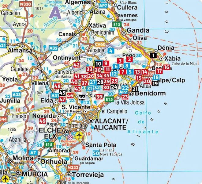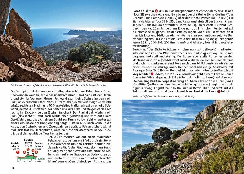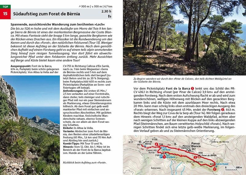 Vom entspannten Spaziergang am Meer über erfrischende Wanderungen entlang von Flüssen und durch Schluchten bis zu aussichtsreichen Gipfeltouren - die Auswahl in diesem Wanderführer ist vielseitig. Kurze, entspannte Ausflüge in der Nähe beliebter Ferienorte wie Dénia, Calp und Benidorm wechseln sich ab mit anspruchsvolleren Touren in abgelegene Bergregionen in der Provinz Alicante und auf die höchsten Berge der Iberischen Halbinsel. Wander-Highlights sind verborgene Quellen, faszinierende Höhlen und Täler voller Mandel- und Olivenbäume. Burgen aus maurischer Zeit säumen die Wege. Auch die beiden größten Palmengärten der Welt, in Elche und Orihuela, sind einen Abstecher wert. Jede Wanderung an der Costa Blanca bietet einzigartige Natur- und Kulturerlebnisse.