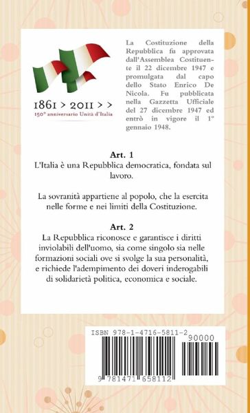 Aonia edizioni. La Costituzione della Repubblica fu approvata dall'Assemblea Costituen-te il 22 dicembre 1947 e promulgata dal capo dello Stato Enrico De Nicola. Fu pubblicata nella Gazzetta Ufficiale del 27 dicembre 1947 ed entrò in vigore il 1º gennaio 1948. Art. 1 L'Italia è una Repubblica democratica, fondata sul lavoro. La sovranità appartiene al popolo, che la esercita nelle forme e nei limiti della Costituzione.
