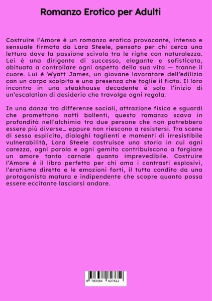 Costruire l'Amore è un romanzo erotico provocante, intenso e sensuale firmato da Lara Steele, pensato per chi cerca una lettura dove la passione scivola tra le righe con naturalezza. Lei è una dirigente di successo, elegante e sofisticata, abituata a controllare ogni aspetto della sua vita - tranne il cuore. Lui è Wyatt James, un giovane lavoratore dell'edilizia con un corpo scolpito e una presenza che toglie il fiato. Il loro incontro in una steakhouse decadente è solo l'inizio di un'escalation di desiderio che travolge ogni regola. In una danza tra differenze sociali, attrazione fisica e sguardi che promettono notti bollenti, questo romanzo scava in profondità nell'alchimia tra due persone che non potrebbero essere più diverse... eppure non riescono a resistersi. Tra scene di sesso esplicito, dialoghi taglienti e momenti di irresistibile vulnerabilità, Lara Steele costruisce una storia in cui ogni carezza, ogni parola e ogni gemito contribuiscono a forgiare un amore tanto carnale quanto imprevedibile. Costruire l'Amore è il libro perfetto per chi ama i contrasti esplosivi, l'erotismo diretto e le emozioni forti, il tutto condito da una protagonista matura e indipendente che scopre quanto possa essere eccitante lasciarsi andare.