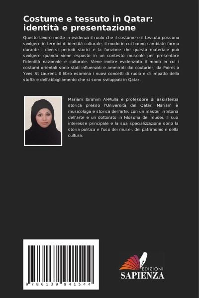 Questo lavoro mette in evidenza il ruolo che il costume e il tessuto possono svolgere in termini di identità culturale, il modo in cui hanno cambiato forma durante i diversi periodi storici e la funzione che questo materiale può svolgere quando viene esposto in un contesto museale per presentare l'identità nazionale e culturale. Viene inoltre evidenziato il modo in cui i costumi orientali sono stati influenzati e ammirati dai couturier, da Poiret a Yves St Laurent. Il libro esamina i nuovi concetti di ruolo e di impatto della stoffa e dell'abbigliamento che si sono sviluppati in Qatar.