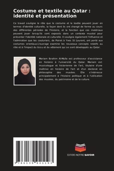 Ce travail souligne le rôle que le costume et le textile peuvent jouer en termes d'identité culturelle, la façon dont ils ont changé de forme au cours des différentes périodes de l'histoire, et la fonction que ces matériaux peuvent jouer lorsqu'ils sont exposés dans un contexte muséal pour présenter l'identité nationale et culturelle. Il souligne également l'influence et l'admiration que les couturiers, de Poiret à Yves St Laurent, ont porté aux costumes orientaux.L'ouvrage examine les nouveaux concepts relatifs au rôle et à l'impact du tissu et du vêtement qui se sont développés au Qatar.