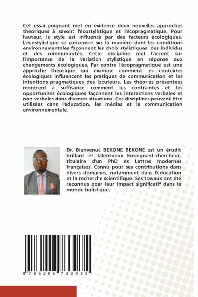 Cet essai poignant met en évidence deux nouvelles approches théoriques à savoir: l'écostylistique et l'écopragmatique. Pour l'auteur, le style est influencé par des facteurs écologiques. L'écostylistique se concentre sur la manière dont les conditions environnementales façonnent les choix stylistiques des individus et des communautés. Cette discipline met l'accent sur l'importance de la variation stylistique en réponse aux changements écologiques. Par contre l'écopragmatique est une approche théorique qui examine comment les contextes écologiques influencent les pratiques de communication et les intentions pragmatiques des locuteurs. Les théories présentées montrent à suffisance comment les contraintes et les opportunités écologiques façonnent les interactions verbales et non verbales dans diverses situations. Ces disciplines peuvent être utilisées dans l'éducation, les médias et la communication environnementale.