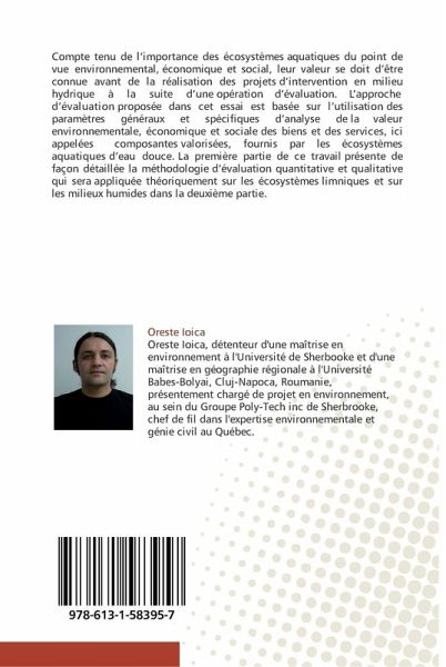 Compte tenu de l'importance des écosystèmes aquatiques du point de vue environnemental, économique et social, leur valeur se doit d'être connue avant de la réalisation des projets d'intervention en milieu hydrique à la suite d'une opération d'évaluation. L'approche d'évaluation proposée dans cet essai est basée sur l'utilisation des paramètres généraux et spécifiques d'analyse de la valeur environnementale, économique et sociale des biens et des services, ici appelées composantes valorisées, fournis par les écosystèmes aquatiques d'eau douce. La première partie de ce travail présente de façon détaillée la méthodologie d'évaluation quantitative et qualitative qui sera appliquée théoriquement sur les écosystèmes limniques et sur les milieux humides dans la deuxième partie.