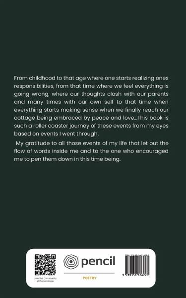 From childhood to that age where one starts realizing ones responsibilities, from that time where we feel everything is going wrong, where our thoughts clash with our parents and many times with our own self to that time when everything starts making sense when we finally reach our cottage being embraced by peace and love...This book is such a roller coaster journey of these events from my eyes based on events I went through. My gratitude to all those events of my life that let out the flow of words inside me and to the one who encouraged me to pen them down in this time being. ¿