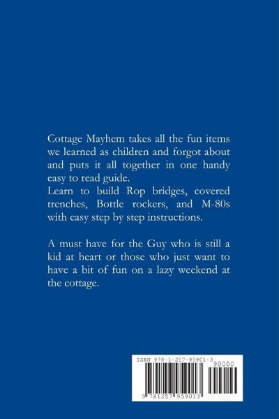 Cottage Mayhem takes all the fun items we learned as children and forgot about and puts it all together in one handy easy to read guide. Learn to build Rope bridges, covered trenches, Bottle rockers, and M-80s with easy step by step instructions. A must have for the Guy who is still a kid at heart or those who just want to have a bit of fun on a lazy weekend at the cottage.