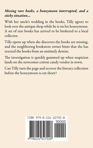 Missing rare books, a honeymoon interrupted, and a sticky situation... With her uncle's wedding in the books, Tilly agrees to look over the antique shop while he is on his honeymoon. A set of rare books has arrived to be brokered to a local collector. Tilly opens up when she discovers the books are missing, and the neighboring bookstore owner hints that she has rescued the books from an untimely demise. The investigation is quickly gummed up when suspicion lands on the newcomer cotton candy vendor in town. Can Tilly turn the page and recover the literary collection before the honeymoon is cut short?
