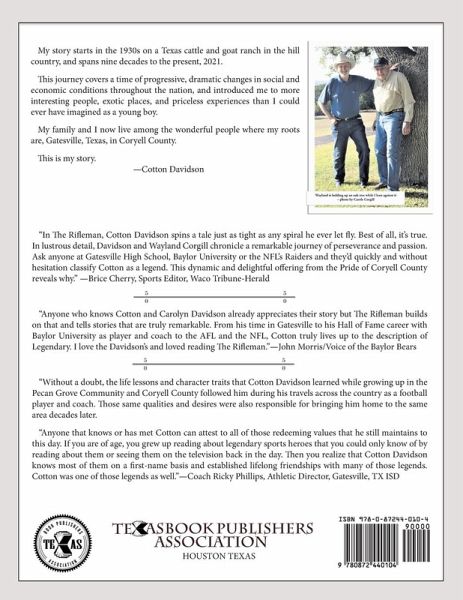 Cotton Davidson, the Rifleman of the AFL is a heartfelt memoir of Francis Marion "Cotton" Davidson and the motivating story of his rise from simple beginnings in a small central Texas town to an accomplished professional football career. His athletic career began at Gatesville High School and led to a scholarship to play football at Baylor University. As quarterback, Davidson lettered for the Bears from 1951-53 earning the nickname "The Rifleman" for his bullet-like passing game. He caught the eye of pro recruiters and was the first round draft pick in 1954 for the Baltimore Colts. After being drafted and serving his country in the Army, Davidson returned to pro football where he enjoyed a lengthy career playing for the Dallas Texans (Now Kansas City Chiefs) and then the Oakland Raiders. Also an accomplished punter and placekicker, he was selected to play in the AFL all-star game in 1961 and 1963. Upon retirement from pro football, Davidson went on to become the Assistant Coach under Grant Teaff at his alma mater Baylor University. During his 21-year career coaching quarterbacks for the Baylor Bears, they won two Southwest Conference Championships and played in 20 post season bowl games. Davidson has been inducted into the Texas High School Football Hall of Fame, the Southwest Conference Hall of Fame and in 2019, he lit the eternal flame for the last time at Oakland Coliseum before the first game as the Raiders kicked off their last season playing before their move to Las Vegas. While Davidson has received great recognition for his achievements on and off the field, his greatest accomplishment is the partnership he shares with his devoted wife of 60 years, Carolyn, his four children, twelve grandchildren and now many great grandchildren.