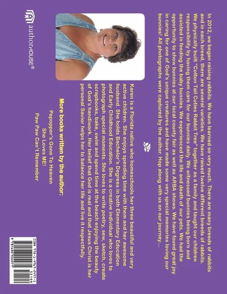 In 2012, we began raising rabbits. We have learned so very much. There are many breeds of rabbits and in each breed, there are several varieties. We have raised twelve different breeds of rabbits. We physically built "Cotton Tail Cuties Rabbit Tree" together as a family and taught our children responsibility by having them care for our bunnies daily. We witnessed bunnies being born and assisted in feeding the baby bunnies. We experienced the life and death of our pets. We had the opportunity to show bunnies at our local county fair as well as ARBA shows. We have found great joy in caring for one of God's unique creatures and have made some very special memories loving our bunnies! All photographs were captured by the author. Hop along with us on our journey...