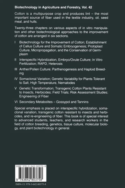 Section I Biotechnology for the Improvement of Cotton; Establishment of Callus Culture and Somatic Embryogenesis; Protoplast Culture; Micropropagation and the Conservation of Germplasm.- I.1 Biotechnology for the Improvement of Cotton.- I.2 Establishment of Callus Culture, Somatic Embryogenesis, and the Regeneration of Cotton Plants.- I.3 Regeneration of Plants from Cotton Protoplasts.- I.4 Micropropagation and the Conservation of Germplasm of Cotton.- Section II Interspecific Hybridization, Embryo/Ovule Culture; In Vitro Fertilization; RAPD; Heterosis.- II.1 Interspecific Hybridization in Cotton Through Embryo Rescue and Culture.- II.2 In Vitro Fertilization in Cotton.- II.3 In Vitro Culture of Cotton Ovules.- II.4 Use of Random Amplified Polymorphic DNA (RAPD) Markers to Assist Wide Hybridization in Cotton.- II.5 Heterosis in Cotton.- Section III Anther/Pollen Culture; Parthenogenesis and Haploid Breeding.- III.1 Anther Culture Studies and Pollen Embryogenesis in Cotton.- III.2 In Vitro Culture of Isolated Pollen of Cotton.- III.3 Parthenogenesis and Haploid Breeding in Gossypium hirsutum.- Section IV Somaclonal Variation/Genetic Variability; Plants Tolerant to Salt and Water Stress, High Temperature, and Nematodes (for plants resistant to insects and herbicides see Chaps. V.2,3 this Volume).- IV.1 Somaclonal Variation in Cotton.- IV.2 Salt and Water Stress-Tolerant Cotton.- IV.3 In Vitro Regeneration of High Temperature-Resistant Cotton Plants.- IV.4 Nematode Resistance in Cotton.- Section V Genetic Transformation; Transgenic Cotton Resistant to Insects and Herbicides; Field Trials; Risk Assessment Studies; Gentic Engineering of Fiber.- V.I Genetic Transformation of Cotton Through Particle Bombardment.- V.2 Insect-Resistant Transgenic Cotton.- V.3 Transgenic Cotton Resistant to the Herbicide 2,4-D.- V.4 Effect of Transgenic Cotton Expressing the Bacillus thuringiensis var. kurstaki Endotoxin on Soil Microorganisms - Risk Assessment Studies.- V.5 Genetic Engineering of Cotton Fiber.- Section VI Secondary Metabolites - Gossypol and Tannins.- VI.1 Gossypol - A Unique Biologically Active Compound from the Cotton Plant.- VI.2 Tannins in Cotton.