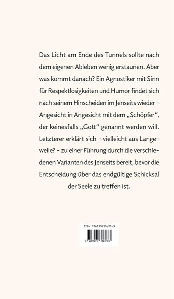 Das Licht am Ende des Tunnels sollte nach dem eigenen Ableben wenig erstaunen. Aber was kommt danach? Ein Agnostiker mit Sinn für Respektlosigkeiten und Humor findet sich nach seinem Hinscheiden im Jenseits wieder - Angesicht in Angesicht mit dem "Schöpfer", der keinesfalls "Gott" genannt werden will. Letzterer erklärt sich - vielleicht aus Langeweile? - zu einer Führung durch die verschiedenen Varianten des Jenseits bereit, bevor die Entscheidung über das endgültige Schicksal der Seele zu treffen ist.