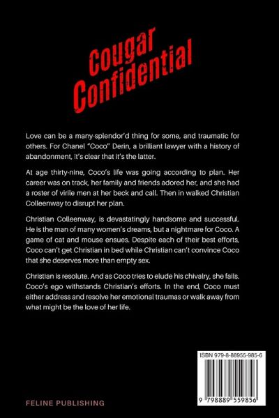 Chanel "Coco" Derin doesn't believe in happily ever after, or rather, not anymore. She believes in being successful, and she is. Coco is a beautiful single woman with the world in her hands. She is a brilliant lawyer on her way to becoming a partner and has a loving family and friends who all adore her. Besides, who needs happily ever after when you have a revolving door of strapping, handsome men who can't get enough of you? Coco knows what she wants and how to get it, no strings attached, required, or wanted-that is, until the day Christian Colleenway enters her orbit. Devastatingly handsome with a multi-million-dollar brand, Christian is a dream client Coco can't get wait to get her hands on-figuratively, and literally. And it doesn't help that every time they meet, sparks fly. The chemistry between them is intense. But when Christian asks for more than she's ready to give, it starts a game of cat and mouse that neither can escape. Watch the sultry story unfold in Cougar Confidential: House of Chanel by T.O. Turner. With opposing agendas, neither will give in, but they can't stay away either. Although she can't shake her fear of abandonment, he drew Coco to him like a moth to a flame. Christian knows he can make Coco happy-but he also knows that the best gift he can give her is time. Filled with mutual attraction and longing, this book is for anyone who seeks a confident heroine and a hero who can handle a flight risk that is disconnected from her feelings. This steamy romance will have you looking inward as you recognize your own fears of intimacy with every page turned. More details about this book below - Authored by T.O. Turner - A novelette with 16 chapters - Available in paperback, with 90 pages ¿¿Add a copy of Cougar Confidential: House of Chanel - A Romance Novelette to your cart NOW! ¿¿¿