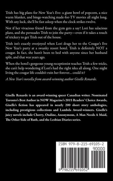 Trish has big plans for New Year's Eve: a giant bowl of popcorn, a nice warm blanket, and binge-watching made-for-TV movies all night long. With any luck, she'll be fast asleep when the clock strikes twelve. Not if her vivacious friend from the gym gets a say! Lori has salacious plans, and she persuades Trish to join the party—even if it takes a touch of trickery to get Trish out of the house. Trish isn't exactly overjoyed when Lori drags her to the Cougar's Eve New Year's party at a swanky resort hotel. Trish is definitely NOT a cougar. In fact, she hasn't been to bed with anyone since her husband split, and that was years ago. When the hotel's gorgeous young receptionist teaches Trish a few tricks, she can't help wondering if Lori's had the right idea all along. One night living the cougar life couldn't ruin her forever… could it? A New Year's novella from award-winning author Giselle Renarde.