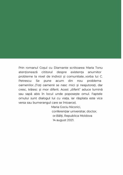 Romanul Cos¿ul cu Diamante este un serial formidabil de romane Romanul Cos¿ul cu Diamante este un roman istoric fiindc¿ descrie perioada istoric¿ dintre doü secole. Romanul Cos¿ul cu Diamante este un roman sociologic fiindc¿ arat¿ veridic forfota în reläia individ-individ; individ-societate atât în timpurile sovietice, cât ¿i în cadrul comunit¿¿ilor desprinse de la vatr¿ prin emigrare. Romanul Cos¿ul cu Diamante este un roman politic fiindc¿ descrie, cu succes, carapacea guvernelor corupte care compromit total valorile umane. Romanul Cos¿ul cu Diamante este un roman psihologic fiindc¿ eroina central¿ Delia este o victim¿ a împrejur¿rilor ¿i o victim¿ a propriei suferin¿e. Romanul Cos¿ul cu Diamante este un roman poli¿ienesc c¿ în el g¿sim intrüi (Feofania, Culune, Safta, Cozma) care-¿i fac mendrele în numele statutului, f¿r¿ a fi träi la r¿spundere. Romanul Cos¿ul cu Diamante este un roman de ac¿iune ¿i de groaz¿. Viäa omului depinde de cheful unor C¿l¿i sociali care comit atrocit¿¿i, dar r¿mân mereu cei favorizäi de regime putrede gata s¿ în¿büe orice firicel de nou venit din afara cercului lor. Romanul Cos¿ul cu Diamante con¿ine elemente de fantastic¿ când Delia este invitat¿ de scriitoarea Martha Bibescu ¿i George Basarb Brâncoveanu s¿ descopere adev¿ruri la care ea caut¿ mereu r¿spuns. Romanul Cos¿ul cu Diamante este ¿i un roman de dragoste de la care s-au pornit toate ac¿iunile. Romanul Cos¿ul cu Diamante con¿ine sute de citate despre valoare, talent, moral¿, divinitate. Victor Podaru New-York, SUA 1 mai 2023
