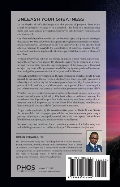Unleash Your Greatness In the depths of life's challenges and the pursuit of purpose, there exists a path to greatness waiting to be unleashed. This book is a transformative guide that takes you on a remarkable journey of self-discovery, resilience, and empowerment. Could Be and Should Be unveils the profound insights and practical strategies that author Dr. Dotun Oyewole has gained through personal trials and triumphant experiences. Drawing from the rich tapestry of his own life, this book offers a roadmap to navigate the complexities of existence, unravel the layers of self-doubt, and tap into the limitless potential that resides within each one of us. With an unwavering belief in the human spirit and a deep-rooted understanding of the divine forces at play, Dr. Oyewole invites you to embark on a transformative expedition. From the captivating pages of this book, you will embark on a journey that challenges conventional thinking, ignites profound introspection, and guides you toward a life of purpose and fulfillment. Through heartfelt storytelling and thought-provoking insights, Could Be and Should Be uncovers the secrets to unlocking your inner strength, overcoming adversity, and embracing the fullness of your unique identity. It delves into the power of faith, resilience, and the unwavering support of loved ones to guide you to harness your true potential and achieve greatness in every aspect of life. Whether you are seeking personal growth, professional success, or a deeper connection with your spirituality, this book offers a profound roadmap for transformation. It provides practical tools, inspiring anecdotes, and profound wisdom that will empower you to rise above life's challenges, redefine your limitations, and step into a life of purpose and abundance. Prepare to be captivated by the transformative power of Could Be and Should Be. As you delve into its pages, you will be inspired to embrace your unique journey, unleash your untapped potential, and embark on a path that leads to a life filled with purpose, joy, and extraordinary fulfillment. Are you ready to embark on the extraordinary journey of self-discovery and unleash the greatness that resides within you? The adventure begins here.