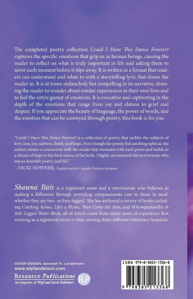 The completed poetry collection Could I Have This Dance Forever? captures the specific emotions that grip us as human beings, causing the reader to reflect on what is truly important in life and asking them to savor each moment before it slips away. It is written in a format that readers can understand and relate to with a storytelling lyric that draws the reader in. It is at times melancholy but compelling in its narrative, drawing the reader to wonder about similar experiences in their own lives and to feel the entire gamut of emotions. It is evocative and captivating in the depth of the emotions that range from joy and elation to grief and despair. If you appreciate the beauty of language, the power of words, and the emotion that can be conveyed through poetry, this book is for you.