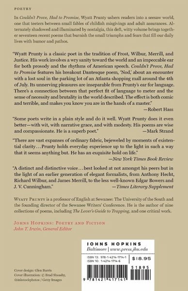In Couldn't Prove, Had to Promise, Wyatt Prunty ushers readers into a seesaw world, one that teeters between small fables of childish misgivings and adult assurances. Alternately shadowed and illuminated by nostalgia, this deft, witty volume brings together seventeen of Prunty's recent poems, seven of which have been previously published in Poetry, the Hopkins Review, the Kenyon Review, and Blackbird. In "Crescent Theater, Schenectady, NY," a silent-movie accompanist reads his foreign newspaper after work as he listens, ever the outsider, "to his children using English / For everything they wish." In "Rules," a small girl, told she can't go to the school nurse "every time some bad thing happens," plaintively wonders, "Where do you go?" And in "Making Frankenstein," a boy who has cajoled his parents into letting him see The Curse of Frankenstein wakes to a nightmare. His father bans horror films as "too anatomical"; "What's anatomical?" the boy wonders. Given a book that catalogs diseases, the worst of which come "from intimate contact," he is horrified by his father's explanation of grownup intimacy: "That's how you made your way into this world." Moving from a wry portrait of a husband-musing on mortality-whose Christmas tie lands in the gravy, to "Reading the Map," which grapples with the cartography of love, to "ad lib," a farewell that redefines farewell, these poems burnish the small triumphs and fears that fill our daily lives with humor and pathos. The book closes with a long, four-part poem, "Nod," which transports readers to a parking lot in July: an asphalt-as-inferno where Cain the cracker, or adversary-as-initiator, the pleuritic voice of disappointment, names the ways inversion makes a lie reliable and works people best as, like a joke or discount price, "It makes you feel you're getting more by giving less." Funny, raw, and colorfully musical, "Nod" plays what teeters, like a tuning fork.