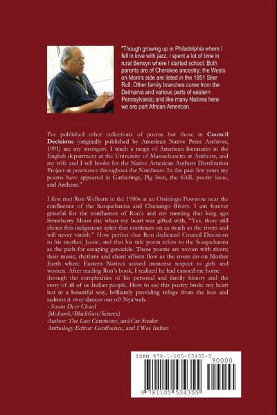 "Yes, there still shines this indigenous spirit that continues on as much as the rivers and will never vanish." How perfect that Ron dedicated Council Decisions to his mother, Jessie, and that his title poem refers to the Susquehanna as the path for escaping genocide. These poems are woven with rivers; their music, rhythms and chant effects flow as the rivers do on Mother Earth where Eastern Natives accord immense respect to girls and women. After reading Ron's book, I realized he had canoed me home through the complexities of his personal and family history and the story of all of us Indian people. How to say this poetry broke my heart but in a beautiful way, brilliantly providing refuge from the loss and sadness it river-dances out of? Nya'weh. - Susan Deer Cloud(Mohawk/Blackfoot/Seneca)