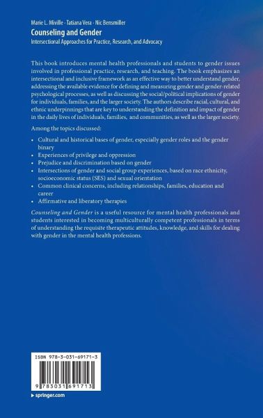 This book introduces mental health professionals and students to gender issues involved in professional practice, research, and teaching. The book emphasizes an intersectional and inclusive framework as an effective way to better understand gender, addressing the available evidence for defining and measuring gender and gender-related psychological processes, as well as discussing the social/political implications of gender for individuals, families, and the larger society. The authors describe racial, cultural, and ethnic underpinnings that are key to understanding the definition and impact of gender in the daily lives of individuals, families, and communities, as well as the larger society.