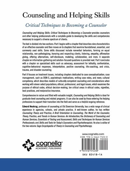 Counseling and Helping Skills: Critical Techniques to Becoming a Counselor provides counselors and other helping professionals with a complete guide to developing the skills and competencies necessary to support a diverse spectrum of clients. The text is divided into two sections. Part I begins with a chapter that describes nine characteristics of an effective counselor and then moves on to chapters that examine foundational, essential, and commonly used skills. Some skills discussed include nonverbal behaviors, forming an equal relationship, non-pathologizing, honoring and respecting clients, listening, empathy, affirmation giving, offering alternatives, self-disclosure, modeling, collaboration, and more. A separate chapter on information-gathering and solution-focused questions is provided next. Part I concludes with a chapter on specialized skills such as advocacy, assessment for lethality, confrontation, cognitive-behavioral responses, interpretation, positive counseling, life-coaching, and crisis, trauma, and disaster counseling. Part II focuses on treatment issues, including chapters dedicated to case conceptualization; case management, such as DSM-5, psychotropic medications, writing case notes, and more; cultural competency, which describes models of culturally competent counseling and considerations when working with eleven select populations; ethical, professional, and legal issues, which examines the purpose of ethical codes, ethical decision-making, ten critical areas in ethical codes, vignettes, best practices, and malpractice insurance. Comprehensive in nature and filled with valuable insight, Counseling and Helping Skills is ideal for graduate-level counseling and related programs. It can also be used by those entering the helping professions to support their transition into the field and serve as a helpful ongoing reference. Dr. Edward Neukrug is a professor of counseling and human services at Old Dominion University. A licensed professional counselor and licensed psychologist, he has experience in outpatient therapy, crisis counseling, substance abuse counseling, couples and family counseling, private practice, and as a school counselor. Dr. Neukrug is a nationally known author, presenter, and researcher. He is the author of eleven books: The Dictionary of Counseling and Human Services; Skills and Techniques for Human Service Professionals; Counseling Theory and Practice (2nd ed.); The World of the Counselor (5th ed.); Experiencing the World of the Counselor: A Workbook for Counselor Educators and Students (4th ed.); Theory, Practice and Trends in Human Services: An Introduction to An Emerging Profession (6th ed.); Essentials of Testing and Assessment for Counselors, Social Workers, and Psychologists (3rd ed.); A Brief Orientation to Counseling: Professional Identity, History, and Standards (2nd ed.); Skills and Tools for Today's Counselors and Psychotherapists; Counseling and Helping Skills: Critical Techniques for Becoming a Counselor; and Sage Encyclopedia of Theory in Counseling and Psychotherapy (editor).