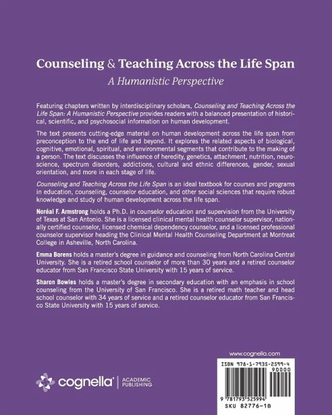 Featuring chapters written by interdisciplinary scholars, Counseling and Teaching Across the Life Span: A Humanistic Perspective provides readers with a balanced presentation of historical, scientific, and psychosocial information on human development. The text presents cutting-edge material on human development across the life span from preconception to the end of life and beyond. It explores the related aspects of biological, cognitive, emotional, spiritual, and environmental segments that contribute to the making of a person. The text discusses the influence of heredity, genetics, attachment, nutrition, neuroscience, spectrum disorders, addictions, cultural and ethnic differences, gender, sexual orientation, and more in each stage of life. Counseling and Teaching across the Life Span is an ideal textbook for courses and programs in education, counseling, counselor education, and other social sciences that require robust knowledge and study of human development across the life span.
