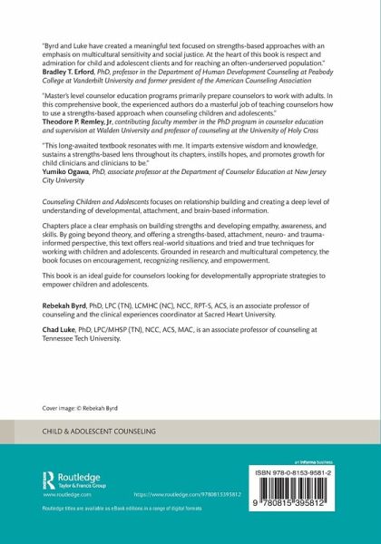 Part 1: Knowledge 1. Introduction and Recognition of the Privilege of Counseling Children and Adolescents 2. Strategies and Interventions for Empathic Connection 3. A Review of Theories as related to Children and Adolescents 4. Understanding Attachment and Development Aspects of Children and Adolescents Part 2: Awareness 5. Legal and Ethical Implication for Working with Minors 6. Family Counseling 7. Parents, Caregivers, and Supportive Adults 8. Trauma and the Child and Adolescent Brain 9. At-Promise Children and Adolescents Part 3: Specific Skills, Theories, and Techniques 10. Children and Adolescents with Myriad Presenting Concerns 11. Grief and Loss Issues in Children and Adolescents 12. Working with Trans and Gender Expansive Children and Adolescents 13. LGB Children and Adolescents 14. Celebrating Diversity 15. Play Therapy 16. Sandtay Therapy 17. Mindfulness Techniques for Working with Children and Adolescents 18. Expressive and Experiential Techniques Appendix