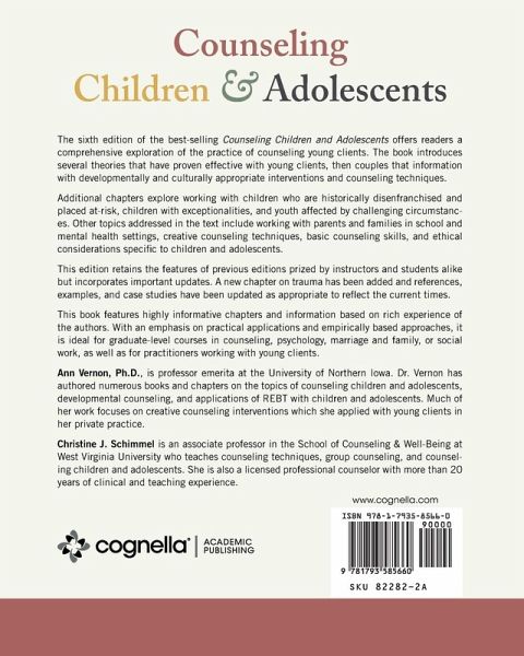 The sixth edition of the best-selling Counseling Children and Adolescents offers readers a comprehensive exploration of the practice of counseling young clients. The book introduces several theories that have proven effective with young clients, then couples that information with developmentally and culturally appropriate interventions and counseling techniques. Additional chapters explore working with children who are historically disenfranchised and placed at-risk, children with exceptionalities, and youth affected by challenging circumstances. Other topics addressed in the text include working with parents and families in school and mental health settings, creative counseling techniques, basic counseling skills, and ethical considerations specific to children and adolescents. This edition retains the features of previous editions prized by instructors and students alike but incorporates important updates. A new chapter on trauma has been added and references, examples, and case studies have been updated as appropriate to reflect the current times. The accompanying Cognella Active Learning for students includes 16 brand-new videos that help make concepts come alive. Get a sneak preview of these videos. This book features highly informative chapters and information based on rich experience of the authors. With an emphasis on practical applications and empirically based approaches, it is ideal for graduate-level courses in counseling, psychology, marriage and family, or social work, as well as for practitioners working with young clients.