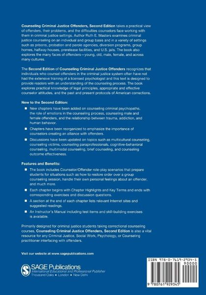 Counseling Criminal Justice Offenders, Second Edition takes a practical view of offenders, their problems, and the difficulties counselors face working with them in criminal justice settings. Author Ruth E. Masters examines criminal justice counseling on an individual and group basis and in a variety of settings such as prisons, probation and parole agencies, diversion programs, group homes, halfway houses, prerelease facilities, and U.S. jails. The book also explores the many faces of offenders - young, old, male, female, and across many cultures. The Second Edition of Counseling Criminal Justice Offenders recognizes that individuals who counsel offenders in the criminal justice system often have not had the extensive training of a licensed psychologist and this text is designed to provide readers with an understanding of the counseling process. The book explores practical knowledge of legal principles, appropriate and effective counselor attitudes, and the past and present protocols of American corrections. Primarily designed for criminal justice students taking correctional counseling courses, Counseling Criminal Justice Offenders, Second Edition is also a vital resource for any Criminal Justice, Social Work, Psychology, or Counseling practitioner interfacing with offenders.
