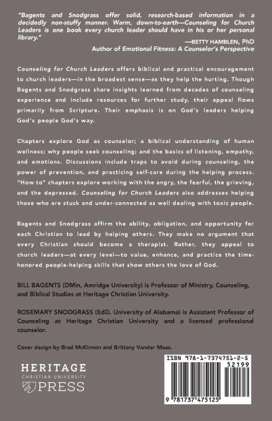 ¿Counseling for Church Leaders offers biblical and practical encouragement to church leaders-in the broadest sense-as they help the hurting. Though Bagents and Snodgrass share insights learned from decades of counseling experience and include resources for further study, their appeal flows primarily from Scripture. Their emphasis is on God's leaders helping God's people God's way. Chapters explore God as counselor; a biblical understanding of human wellness; why people seek counseling; and the basics of listening, empathy, and emotions. Discussions include traps to avoid during counseling, the power of prevention, and practicing self-care during the helping process. "How to" chapters explore working with the angry, the fearful, the grieving, and the depressed. Counseling for Church Leaders also addresses helping those who are stuck and under-connected as well dealing with toxic people. Bagents and Snodgrass affirm the ability, obligation, and opportunity for each Christian to lead by helping others. They make no argument that every Christian should become a therapist. Rather, they appeal to church leaders-at every level-to value, enhance, and practice the time-honored people-helping skills that show others the love of God.