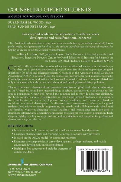 "Drs. Susannah Wood and Jean Peterson have combined forces to move the field of school counseling forward in its work on behalf of gifted students... This subtle regularizing into appropriate school counseling practice is actually quite radical as is makes it clear that the time has passed to consider whether we should be concerned with the nature and needs of students with gifts and talents, but rather need to move to serving them as a requirement of our profession... And fortunately for all of us, the authors provide a clearly articulated roadmap for helping us live up to our professional responsibilities." --Tracy L. Cross, Ph.D. Created to fill a gap in both counselor education and gifted education, this is the only up-to-date text to provide a concise and practical overview of counseling services designed specifically for gifted and talented students. Grounded in the American School Counselor Association (ASCA) National Model for counseling programs, the book illuminates specific knowledge, awareness, and skills school counselors need to address concerns related not only to academics, but also to social and emotional development of this population. The text delivers a theoretical and practical overview of gifted and talented education in the United States and the responsibilities of school counselors as they pertain to this unique population. Going well beyond the common call to provide academic challenge, the book considers special characteristics of gifted and talented students as it examines the complexities of career development, college readiness, and concerns related to social and emotional development. It discusses how counselors can advocate for gifted students, lead efforts to match programming and needs, and collaborate with school staff and families. Vignettes depicting critical incidents and epitomizing needs are used to illuminate differentiated counseling approaches that support this student population. Each chapter highlights a key concept, and curriculum guidelines and resources for professional development support the text. KEY FEATURES:Interweaves school counseling and gifted education research and practice Considers characteristics and counseling concerns associated with giftedness Is based on the ASCA model for counseling programs Examines the complexities of career development, college readiness, and social/emotional development in this population Highlights key concepts and includes vignettes of critical incidents