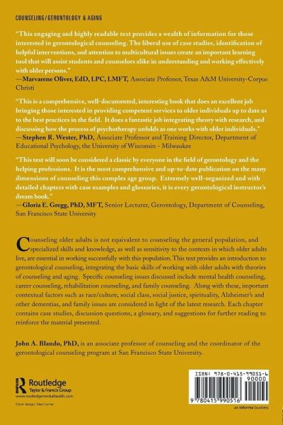 Counseling older adults is not equivalent to counseling the general population, and specialized skills and knowledge, as well as sensitivity to the contexts in which older adults live, are essential in working successfully with this population. This text provides an introduction to gerontological counseling, integrating the basic skills of working with older adults with theories of counseling and aging. Specific counseling issues discussed include mental health counseling, career counseling, rehabilitation counseling, and family counseling. Along with these, important contextual factors such as race/culture, social class, social justice, spirituality, Alzheimer's and other dementias, and family issues are considered in light of the latest research. Each chapter contains case studies, discussion questions, a glossary, and suggestions for further reading to reinforce the material presented.