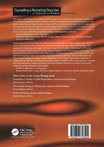 "This book is well timed and critically needed because it is a unique focus specifically working with the individual drug abuser which is written within the Carl Rogers' person-centered approach. This book is matchless and deeply insightful. Bryant-Jefferies offers critical wisdom from his many years of counseling persons with substance abuse problems and brings into the text the guidance and skill of an experienced supervisor. No doubt this book will remain a reference for a long time to come for all of us working in the field of counseling persons with drug abuse problems." - Dana Murphy Parker, in her Foreword, Professor of Nursing, Arizona Western College, Board of Directors, The International Nurses Society on Addictions "Counselling a Recovering Drug User has a story line that gripped me like a magnet from cover to cover. The reader will come away with a heightened awareness and increased knowledge of the complexities of dealing with people who have a drug-related problem. Many people will benefit from this book. The lay reader will find the book an engaging read whilst gaining some insight into the world of drug users and the counselling process. Actual and potential clients may need this and gain encouragement about the benefits of person-centred counselling. Health professionals will find this book provides an easy-to-follow explanation of Carl Roger's counselling model and a unique view on how the counselling relationship allows a troubled client to grow and heal. I enjoyed this book immensely. I highly recommend this book to anyone who has an interest in drug users' problems and the therapeutic relationship." - Dr Peter C Robinson, in his Foreword General Practitioner, Surrey; GP with a Special Interest in Substance Misuse, Guildford, Surrey