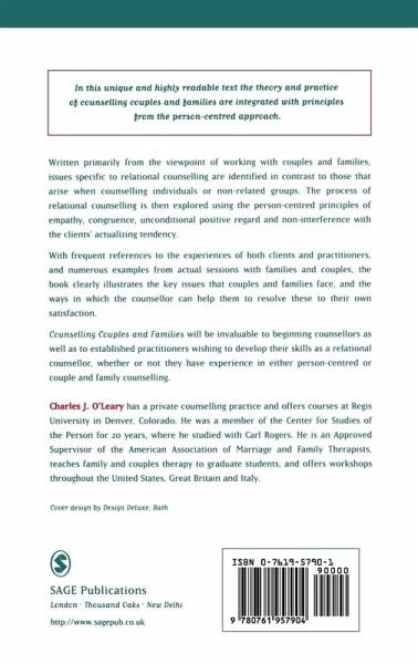 Extra para for end of O'Leary blurb:Counselling Couples and Families will be invaluable to beginning counsellors as well as to established practitioners wishing to develop their skills as a relational counsellor, whether or not they have experience in either person-centred or couple and family counselling.