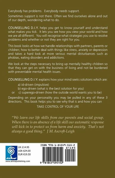 Everybody has problems. Everybody needs support. Sometimes support is not there. Often we find ourselves alone and out of our depth, wondering what to do. COUNSELLING D.I.Y. helps you get to know yourself and understand what makes you tick. It lets you see how you view your world and how we are all different. You will recognise what strategies you use to resolve problems and whether or not they are right for you. This book looks at how we handle relationships with partners, parents or children; how to better deal with things like stress, anxiety or depression and takes a hard look at more serious mental disturbances such as phobias, eating disorders and addictions. We look at the steps necessary to bring up mentally healthy children so that they can get on with the business of living and not be burdened with preventable mental health issues. COUNSELLING D.I.Y. explains how your mind seeks solutions which are: a) id-driven (impulsive) b) ego-driven (what is the best solution for you) or c) superego-driven (how the outside world wants you to be) Depending on your personality you may be pulled in any of these 3 directions. This book helps you to see why that is and how you can TAKE CONTROL OF YOUR LIFE "We learn our life skills from our parents and social group. When there is an absence of a life skill our automatic response will kick in to protect us from harm and anxiety. That's not always a good thing." J M Ascroft-Leigh