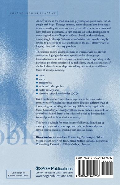 `Any cognitive therapy text which quotes from Alice in Wonderland is off to a good start - and in the case of Counselling for Anxiety Problems, it gets better and better. This is an excellent book written by counselling psychologists, aimed primarily at counselling psychologists. Diana Sanders and Frank Wills are experienced cognitive therapists, who, through various books, are performing a valuable role of building bridges between counsellors and the practice of cognitive therapists. In doing so, they lay to rest many of the misconceptions counsellors may have about cognitive therapy (often based on an 80s version of the therapy), and place particular emphasis on the central importance of therapeutic relationship in cognitive therapy, as in counselling. Their review and discussion of the anxiety disorders is comprehensive and contemporary, as indicated by the number of references from the past five years. Furthermore their clinical experience, as well as their humour, shines through. Although primarily aimed at the counselling market, it will be just as useful for therapists from a variety of backgrounds. I can thoroughly recommend this book' - Amazon Review