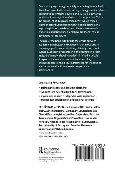 1: Counselling psychology I: Counselling psychology practice as integrating research and theory 2: Organisational counselling psychology 3: How counselling psychologists can employ a role enactment methodology to examine possible causal relationships amongst internal events 4: Qualitative research in counselling psychology 5: Researching the 'therapeutic relationship' in psychoanalysis, counselling psychology and psychotherapy 6: Cross-cultural issues in counselling psychology practice 7: Psychological counselling in primary health care 8: Therapeutic factors in group psychotherapy 9: Transformational research II: Counselling psychology research and practice: some professional dimensions 10: Investigating the learning experiences of counsellors in training 11: Chartered counselling psychology qualification by the independent route and the role of the training co-ordinator 12: Learning through Inquiry (the Dierotao 1 programme at PHYSIS) 13: Phenomenological research on supervision 14: Writing as research in counselling psychology and related disciplines 15: The psychology of 'fame'