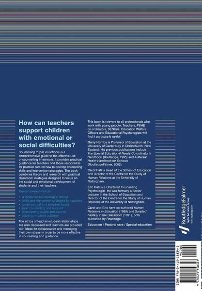 How can teachers support children with emotional or social difficulties? Counselling Pupils in Schools is a comprehensive guide to the effective use of counselling in schools. It provides practical guidance for teachers and those responsible for pastoral care on how to develop counselling skills and intervention strategies. The book combines theory and research with practical classroom strategies designed to focus on the social and emotional development of students and their teachers. Topics covered include: * a model for counselling in school * skills and intervening strategies for teachers * cross-cultural and sensitive issues * peer counselling and support * empowering pupils and parents * classroom-based activities The ethics of teacher-student relationships are also discussed and teachers are provided with ideas for collaboration and managing their own stress in order to be more effective in counselling and guidance. This book is relevant to all professionals who work with young people: Teachers, PSHE co-ordinators, SENCos, Education Welfare Officers and Educational Psychologists will find it particularly useful.