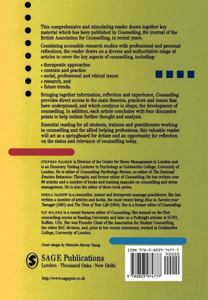 This reader draws together key material which has been published in "Counselling", the journal of the British Association for Counselling, over the last few years. It discusses such topics as: therapeutic approaches; contexts and practice; and research and future trends.