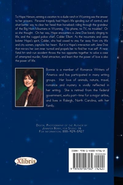 A dash of mystery and romance equals one deliciously fun summer read! Count a Hundred Stars will take you on a journey to the Big Horn Mountains in Wyoming, and on a journey of your heart. When Hope Hanson wins a trip to a dude ranch she believes she will finally get away from it all, relax, and regroup. But a near fatal hit-and-run throws her into the path of police chief, Calder Elliott, to help solve a case of attempted murder, and to learn that the power of love is also the power of life.