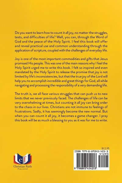 Do you want to learn how to count it all joy, no matter the struggles, tests, and difficulties of life? Well, you can, through the Word of God and the peace of the Holy Spirit. I feel this book will offer and reveal practical use and common understanding through the application of scripture, coupled with the challenges of everyday life. Joy is one of the most important commodities and gifts that Jesus promised His people. This was one of the main reasons why I feel the Holy Spirit urged me to write this book. I felt so inspired and even mandated by the Holy Spirit to release the promise that joy is not limited by life's inconsistencies, but that the true joy of the Lord will help you to accomplish incredible and great things for God, all while navigating and processing the responsibility of a very demanding life. The truth is, we all face various struggles that can push us to new limits that we never previously faced. The challenges of life can be very overwhelming at times, but counting it all joy can bring order to the chaos in our lives. Christians are not immune to feelings of frustrations. Sadly, it has seemingly become the new normal. But when you can count it all joy, it becomes a game changer. I pray this book will be as much a blessing to you as it was for me to write.