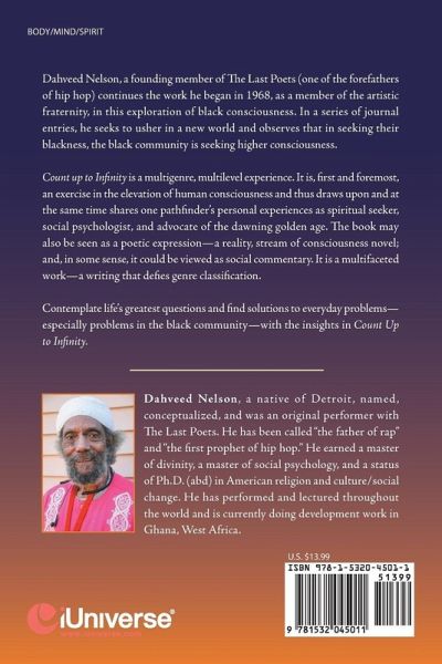 Dahveed Nelson, a founding member of The Last Poets (one of the forefathers of hip hop) continues the work he began in 1968, as a member of the artistic fraternity, in this exploration of black consciousness. In a series of journal entries, he seeks to usher in a new world and observes that in seeking their blackness, the black community is seeking higher consciousness. Count up to Infinity is a multigenre, multilevel experience. It is, first and foremost, an exercise in the elevation of human consciousness and thus draws upon and at the same time shares one pathfinders personal experiences as spiritual seeker, social psychologist, and advocate of the dawning golden age. The book may also be seen as a poetic expressiona reality, stream of consciousness novel; and, in some sense, it could be viewed as social commentary. It is a multifaceted worka writing that defies genre classification. Contemplate lifes greatest questions and find solutions to everyday problemsespecially problems in the black communitywith the insights in Count Up to Infinity.
