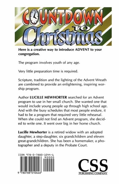 Here is a creative way to introduce ADVENT to your congregation. The program involves youth of any age. Very little preparation time is required. Scripture, tradition, and the lighting of the Advent wreath are combined to provide an enlightening, inspiring worship program. Author Lucille Mewhorter searched for an Advent program to use in her small church. She wanted one that would include young people up through high school age. And with the busy schedules that most people endure, it had to be a program that required very little rehearsal. When she could not find an Advent program, she decided to write one. It went over big in her home church. Lucille Mewhorter is a widow with an adopted daughter, a step-daughter, six grandchildren, and eleven great-grandchildren. Now retired, she has been a homemaker, a photographer, and a deputy in the Probate Court.